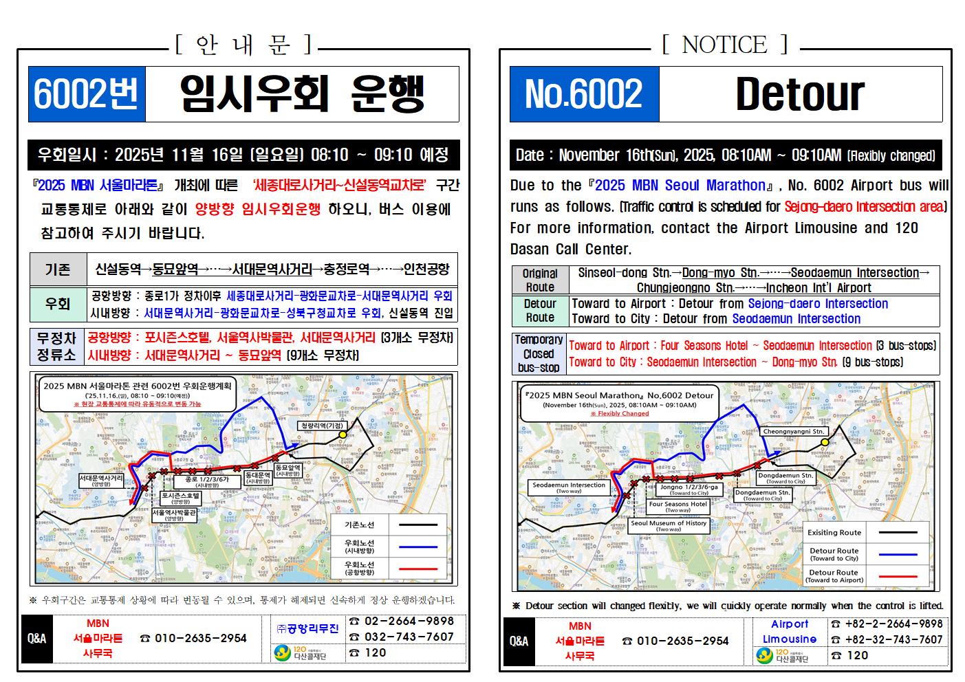★(Detour Notice) 2025년 11월 16일(일), 공항버스 우회 안내 (마라톤, Marathon)