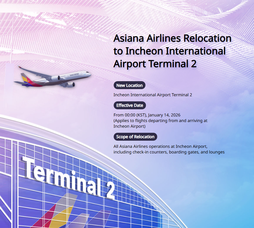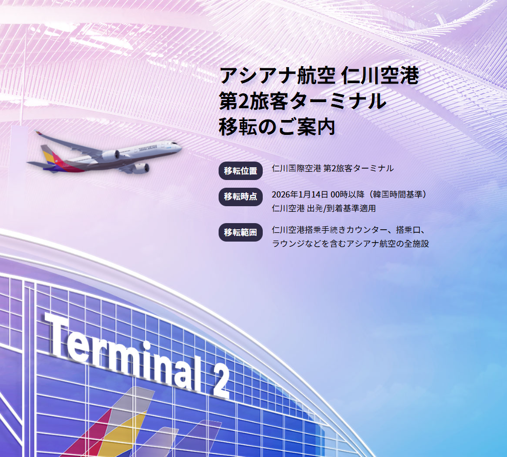 アシアナ航空 仁川空港 第2旅客ターミナル 移転のご案内(2026年1月14日)