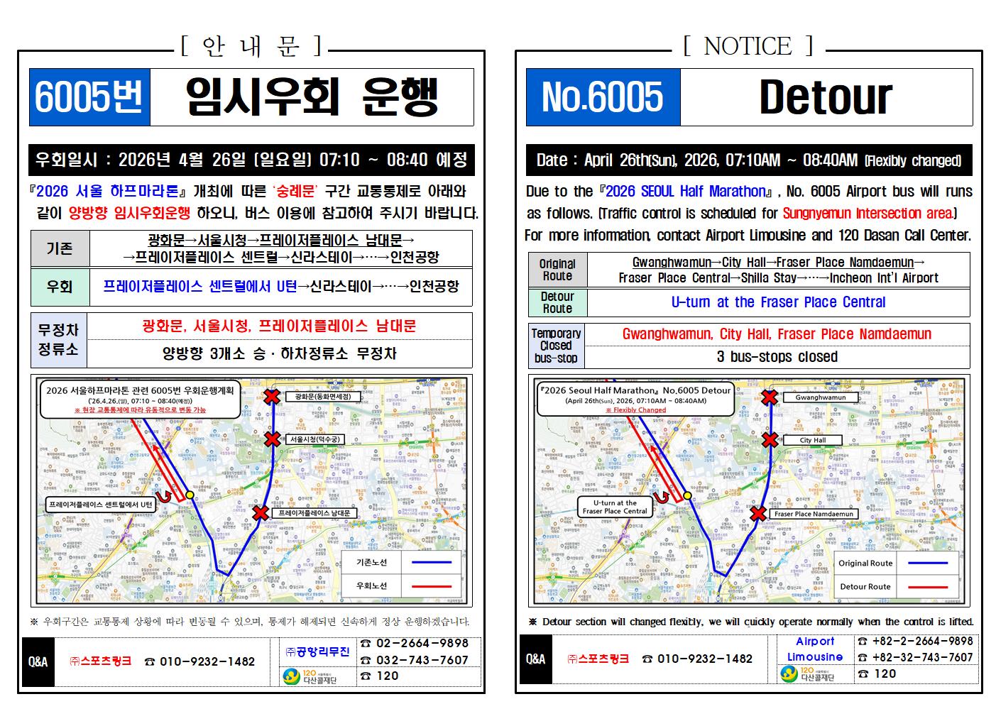 ★공항버스 우회 안내, 2026년 04월 26일(일, Sun) (Detour Notice : 2026 서울 하프마라톤)