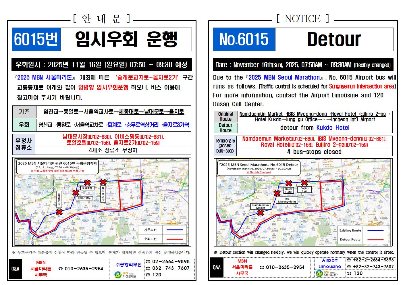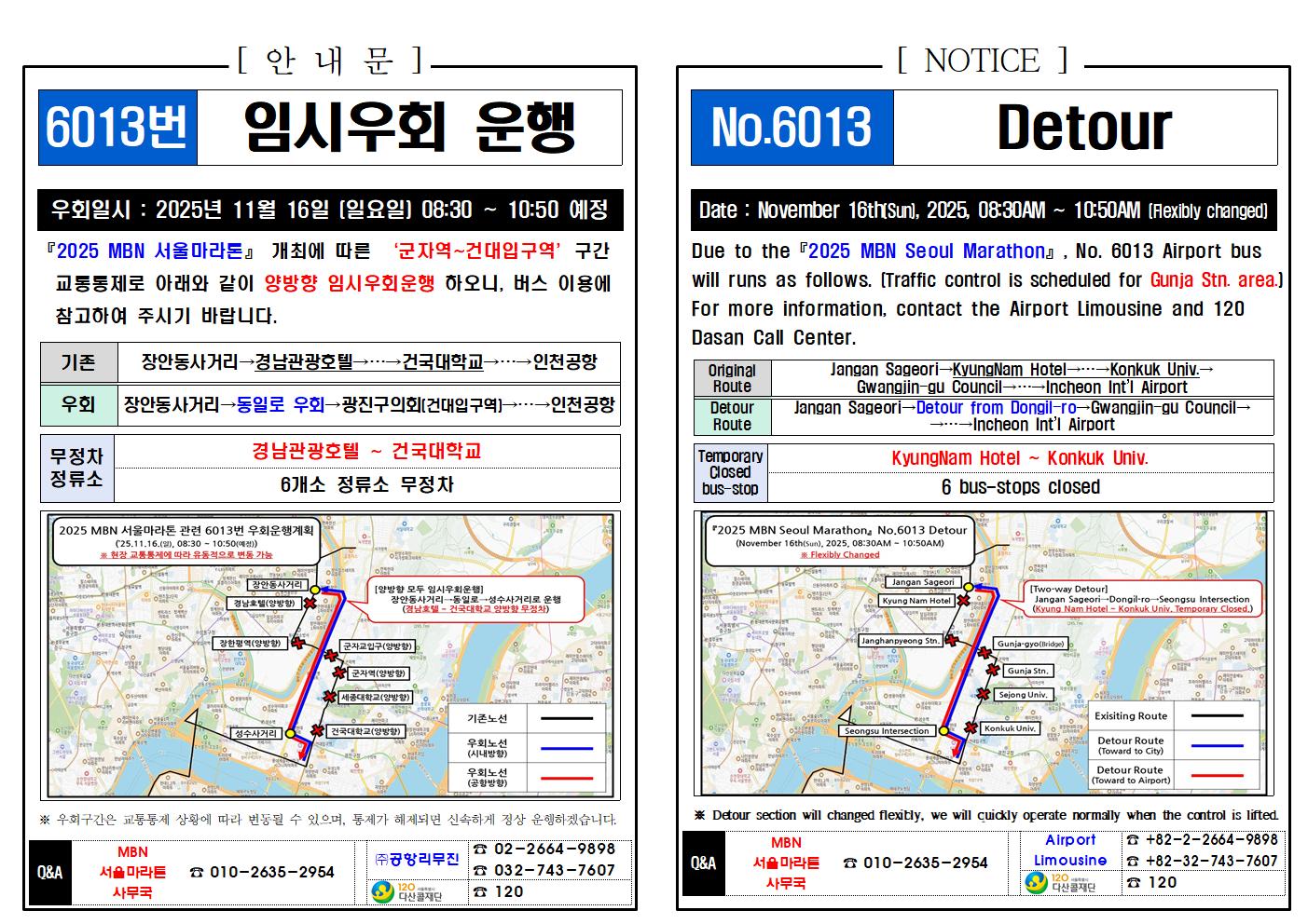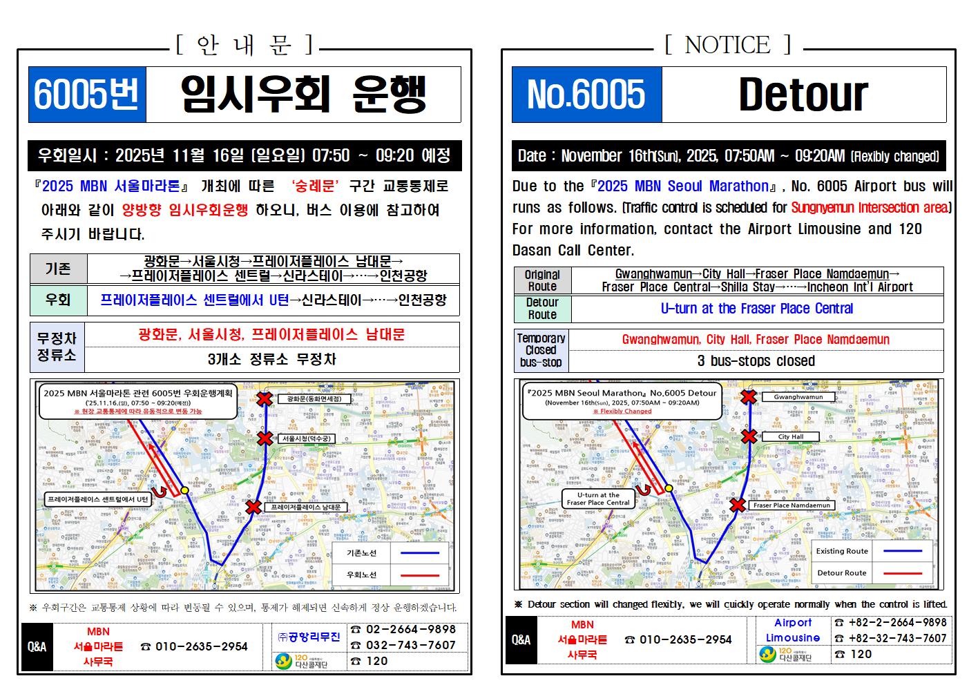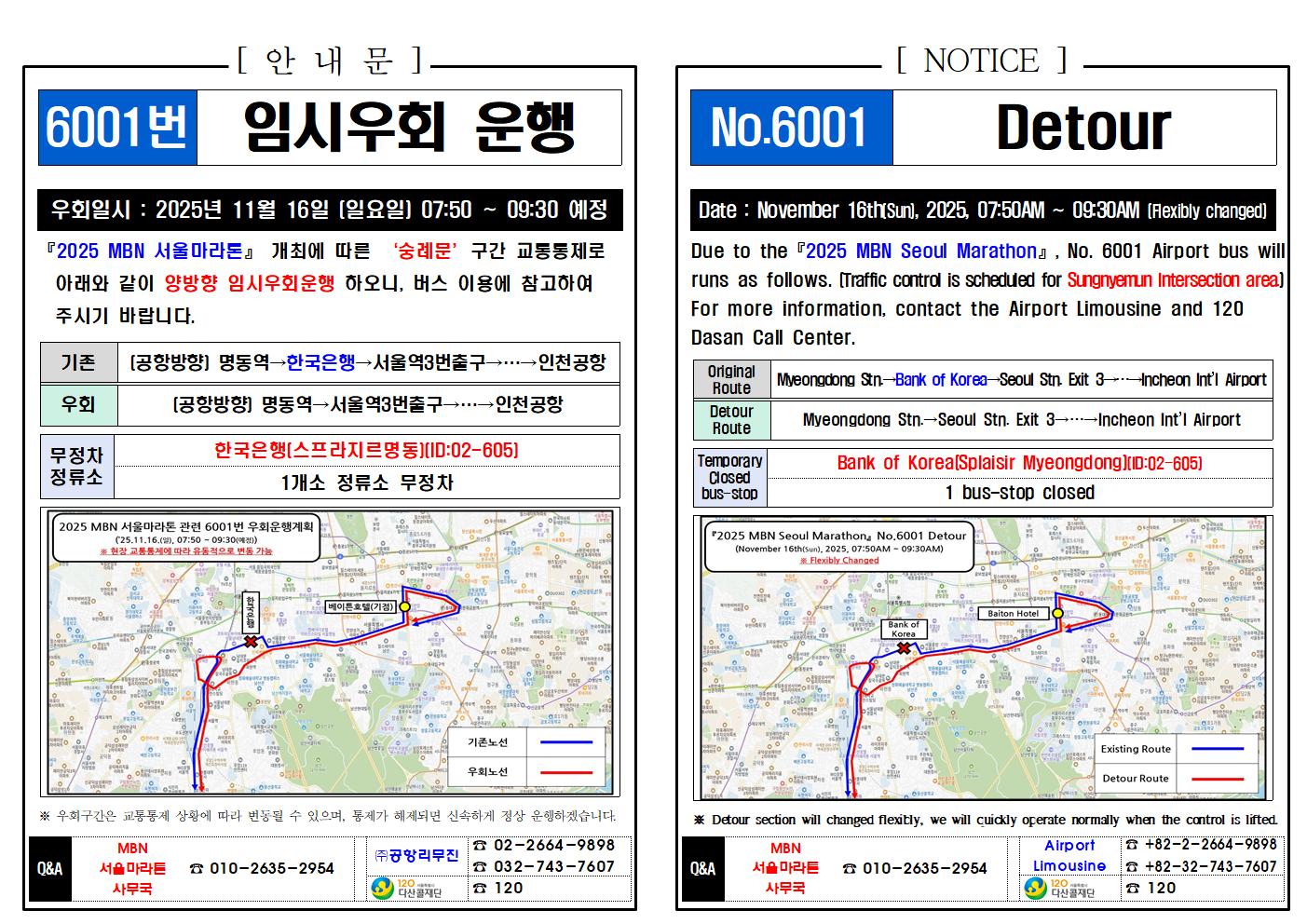 ★(Detour Notice) 2025년 11월 16일(일), 공항버스 우회 안내 (마라톤, Marathon)
