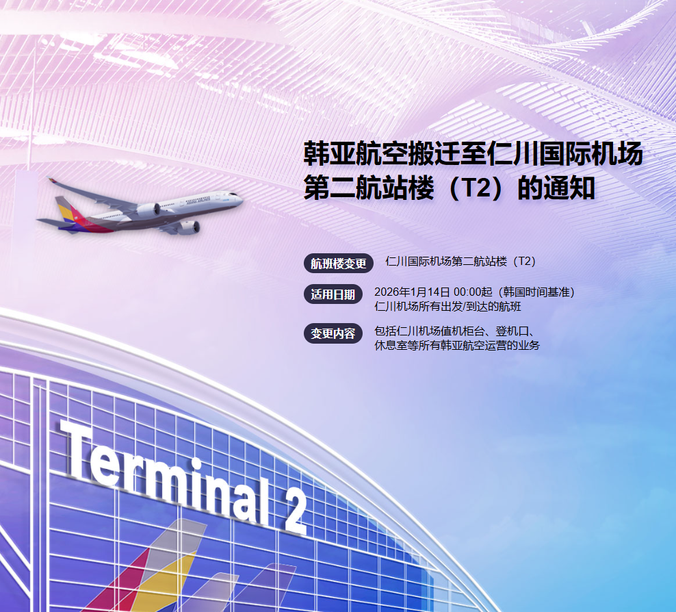 韩亚航空搬迁至仁川国际机场第二航站楼(T2)的通知(2026年1月14日起)