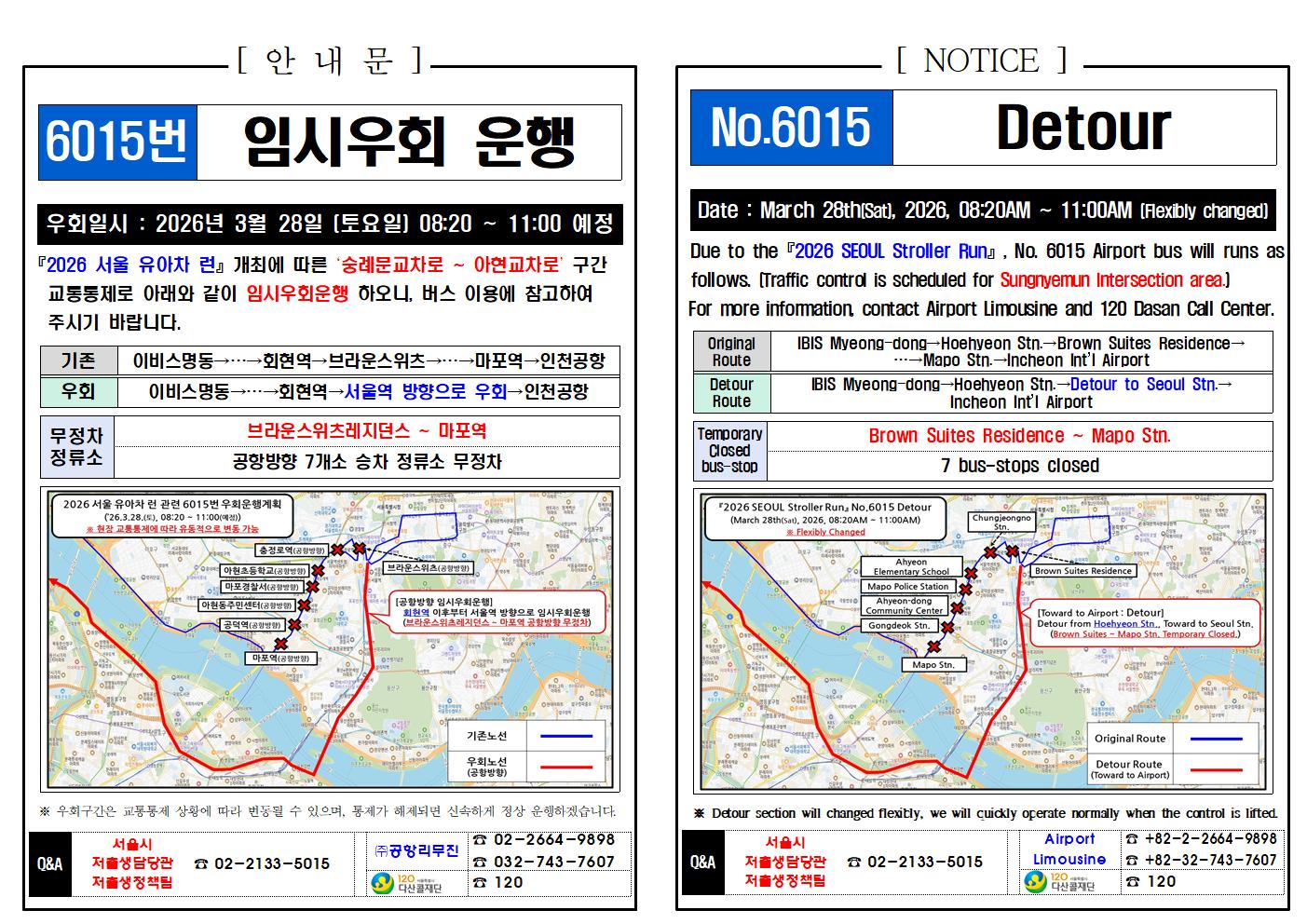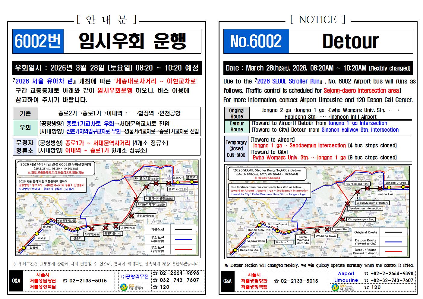 ★공항리무진 우회 및 무정차 안내, 26년 03월 28일(토) (Detour Notice, 서울 유아차런 Seoul Stroller Run)