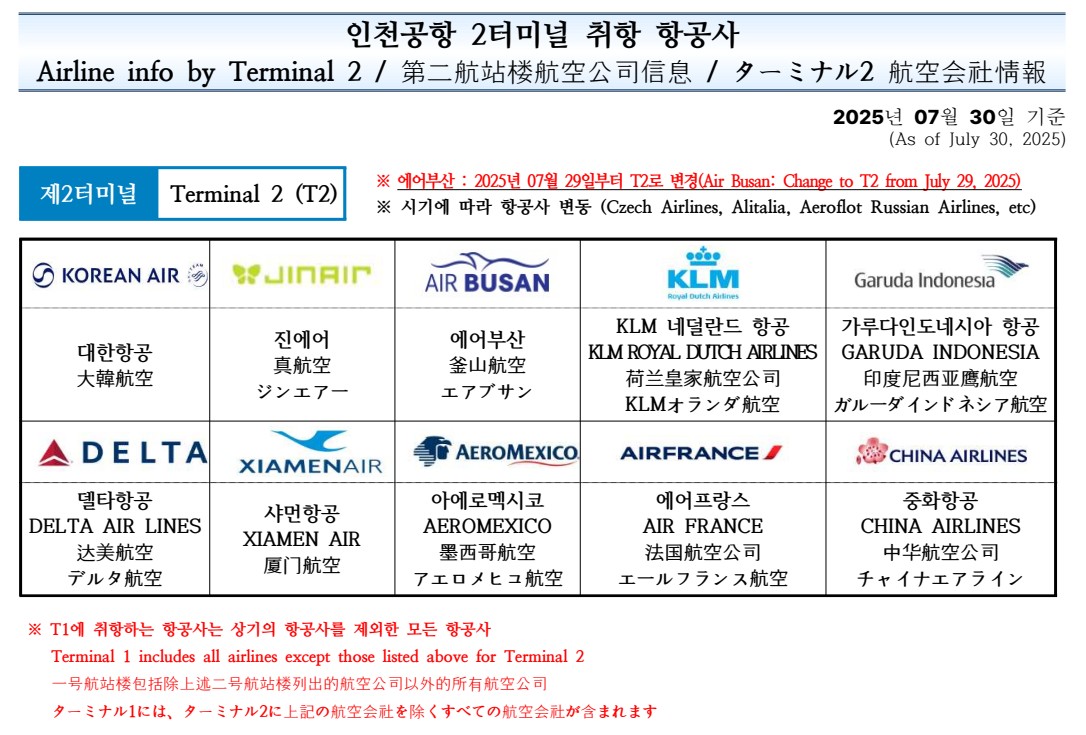 - '25년 7월 29일 00:00 이후 출/도착편 : 제2여객터미널(T2)