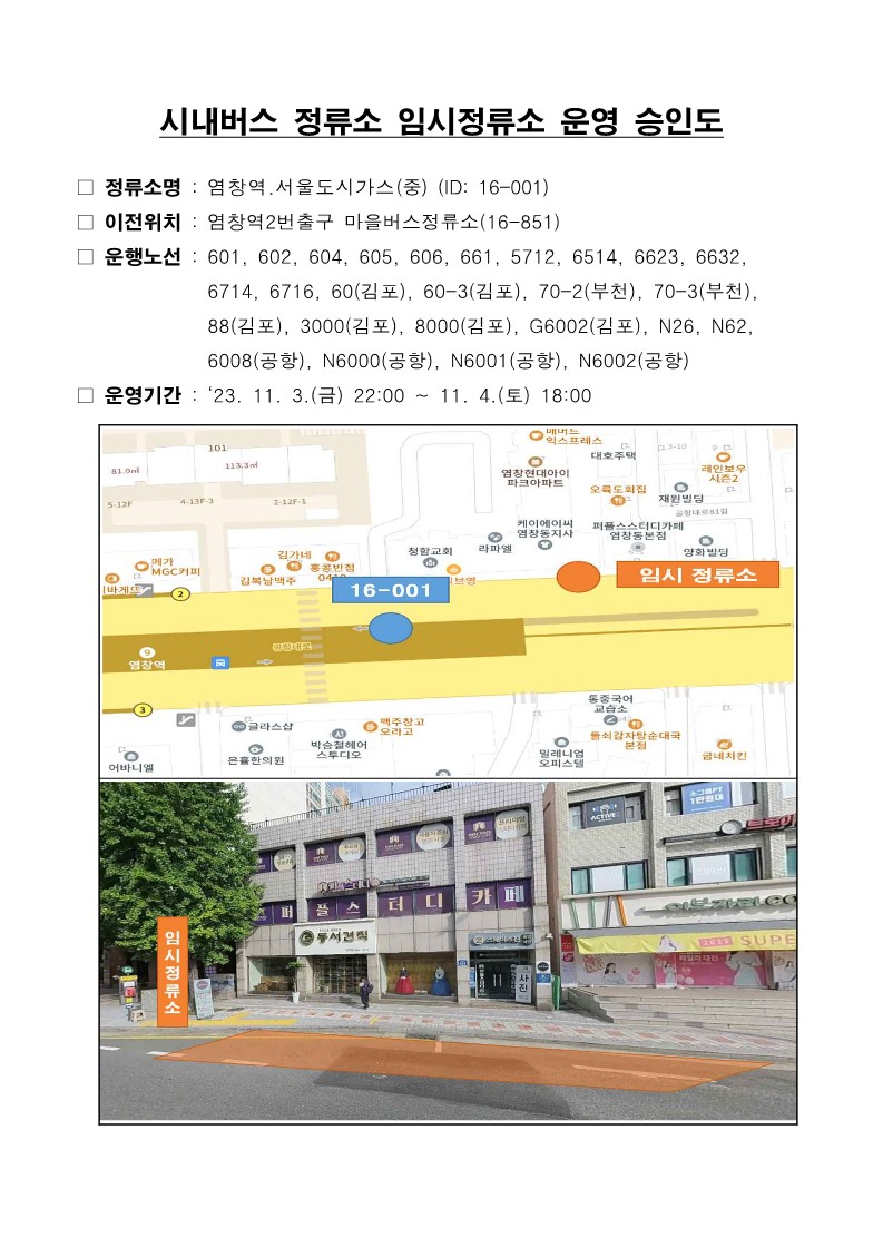염창역 버스중앙차로 정류소 임시 이전 ('23.11.03 22:00 ~ 11.04 18:00)