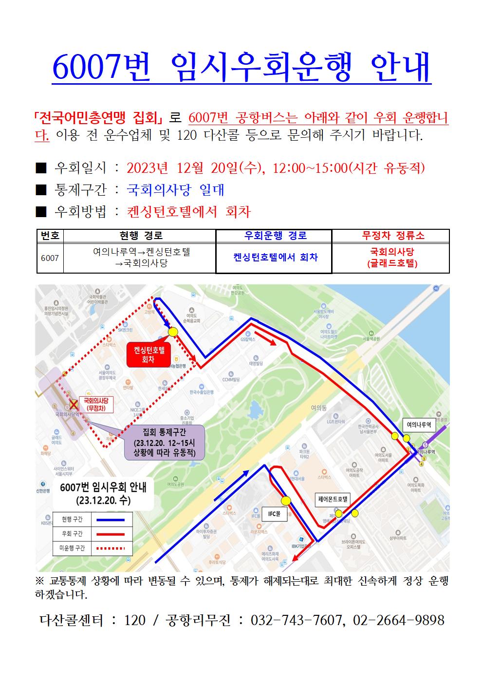 No.6007 Airport Limousne Bus will detour due to the 「Korean Fisher Men’s Group protest」around National Assembly. If you are going to the airport, please go to the bus-stop of Kensington Hotel. If you have any questions, please contact us or 120 Dasan Call Center.
